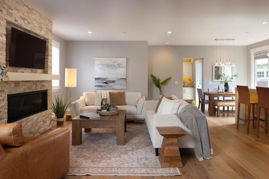Beautifully reimagined Carmel-by-the-Sea home just moments from downtown, thoughtfully remodeled by Lewis Builders with high-end finishes and timeless design throughout. This 3 bedroom, 2.5 bathroom residence offers ~1,850 sq ft of light-filled living space, featuring an open floor plan, 10-foot ceilings, and wide plank oak flooring. The chefs kitchen is equipped with Calcutta marble and Caesarstone countertops, a Bertazzoni stove and hood and a large island with bar seating, flowing seamlessly into the dining area and living room with a striking stone gas fireplace. Custom lighting enhances every space. The main-level primary suite includes a spa-like bath with a skylit shower, his and her sinks, and direct access to the fenced backyard. A convenient half bath is also on the main level. Upstairs, two bright bedrooms share a beautifully appointed full bath, with one offering a private balcony, plus an additional spacious balcony for outdoor enjoyment. The front yard features a welcoming sitting area with a fire pit, perfect for relaxing evenings. Complete with a 1-car attached garage, this turnkey home blends luxury, comfort, and ideal Carmel living.