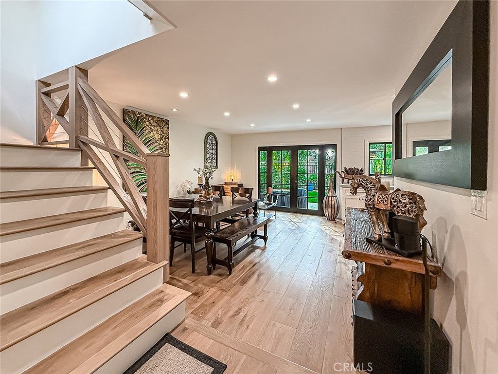 Located in a desirable cul-de-sac across from Deerhill Park, this beautifully remodeled home offers sophisticated upgrades with a modern farmhouse aesthetic. The kitchen features custom cabinetry with soft-close hardware, a large Caesarstone island, Bosch dishwasher, GE Monogram appliances, and elegant pendant lighting. Oak hardwood floors, installed in 2022, enhance the open floor plan and highlight the black vinyl windows and French doors, providing abundant natural light and scenic views. Recent improvements include updated lighting throughout, a fully renovated powder room with a barn wood vanity and farmhouse sink, a remodeled primary suite with dual closets and a modern bath, and a remodeled secondary bath. The backyard is designed for both relaxation and entertainment, featuring a fenced dog run, BBQ area, pet-friendly turf, a seating area, and a freshly painted sport court with a regulation basketball hoop. Energy efficiency is maximized with Tesla solar panels (rented at $130/month), which cover electricity needs and vehicle charging. The finished two-car garage is insulated and equipped with recessed lighting, epoxy flooring, and climate control. Situated in the acclaimed Oak Park School District and within walking distance to schools, parks, trails, and community amenities, this home combines comfort, style, and convenience in a prime location.