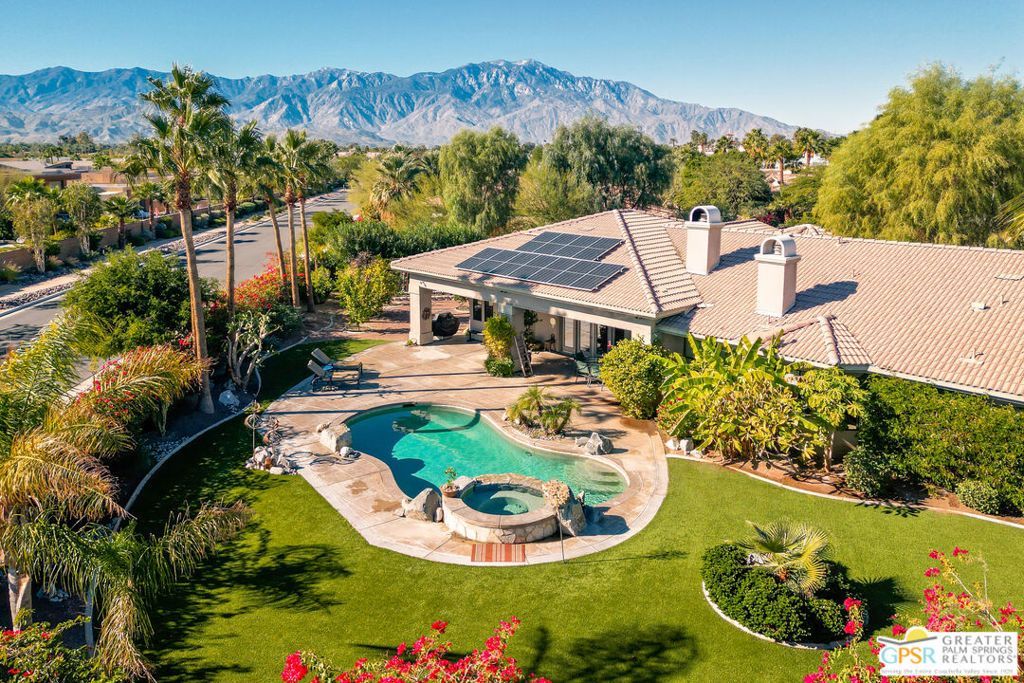 Welcome to your private escape within this contemporary Mediterranean oasis. One of just ten homes in a gated community, this professionally designed residence offers three bedrooms plus a den/office, three bathrooms, and sits on an expansive lot of over 16,000 square feet at the end of the cul-de-sac.From the moment you arrive, you are welcomed through a gated front courtyard adorned with lush landscaping and a tranquil bubbling fountain. Inside, the foyer showcases soaring ceilings and generous wall spaceideal for displaying art and treasured collections. The open living areas are both gracious and well defined, featuring a breakfast nook with bay windows, a formal dining area, and a comfortable living room anchored by a fireplace.The open kitchen is perfectly suited for both everyday living and entertaining, offering guest seating and a spacious pantry. French doors off the south-facing living area open wide to invite natural light and breezes, leading to a private lanai and BBQ, surrounded by verdant backyard complete with a custom salt water pebble tech pool and slate rock waterfall spa.The oversized lot provides ample room for a future ADU and includes a generous garden area with mature fruit treesincluding Lemon, Mexican Lime, Pomegranate, and Fig. Ideal for those with a green thumb. Back inside, the primary bedroom is a true retreat, featuring French doors that open to a seating area and a spa-inspired bath, large walk-in closet, and a fireplace. With direct access to the backyard, the suite offers seamless enjoyment of the outdoor spa on relaxing evenings.Just across the hall one will find a flexible room (listed on records as the fourth bedroom) that opens to the front courtyard and serves beautifully as an office, media room, or creative space.Continuing down the hall, you'll find a convenient powder room with nearby linen storage, along with two additional bedrooms that share a full bathroom. Additional amenities include a three-car garage, a spacious laundry room with extra storage, paid-for solar panels (installed but not connected), and a dual-zone HVAC system.This sophisticated home offers remarkable versatility ideal as a full-time residence, weekend retreat, work-from-home haven, or peaceful escape from the bustle just beyond. Conveniently located near Mission Hills Country Club and a short drive to shopping and dining, this quiet, well-maintained community offers a truly special desert lifestyle.