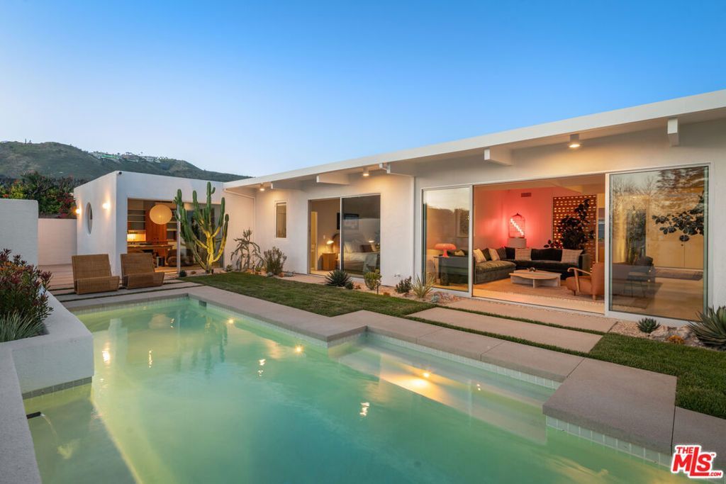 Set in coveted Marquez Knolls, this private 1960s Mid-Century residence has been meticulously restored with exceptional finishes and sweeping ocean views. Spanning approximately 3,503 square feet, the single-level 4-bedroom, 4-bath home offers seamless indoor-outdoor living. A dramatic entry opens to vaulted ceilings and abundant natural light throughout. The layout includes a formal living room with fireplace, separate family and dining rooms, and a chef's kitchen outfitted with high-end appliances and a large center island. The primary suite features a walk-in closet and spa-inspired bath with soaking tub, dual vanities, and walk-in shower.Extensive improvements enhance both the interiors and outdoor living spaces. The grounds have been thoughtfully reimagined with new concrete, updated gates and fencing, a pergola, garden shed, landscape lighting, irrigation, French drains, downspouts, refreshed soil and stonework, and an outdoor shower. The pool and entertaining areas have been completely upgraded with new equipment, plumbing, tile, plaster, and a custom BBQ with countertop and tile finishes, creating an ideal setting for year-round enjoyment. The entire property, including the home and surrounding walls, has been freshly painted and newly landscaped for a polished, cohesive presentation.Prior upgrades further elevate the home, including refreshed interiors, built-ins, upgraded lighting, refinished garage flooring, new electrical in the garage with Tesla universal charger, security cameras, updated bathroom hardware, installed TVs, improved sliding glass doors, and generator servicing.The home has been thoroughly remediated and professionally tested, offering a clean, move-in ready opportunity with documentation available. As the Palisades continues its revitalization, key landmarks are reopeningincluding Palisades High Schoolwith the Village slated to return this summer, signaling strong momentum and renewed energy throughout the community. Ideally located near top-rated schools, dining, and coastal amenities, this home captures the essence of California living.