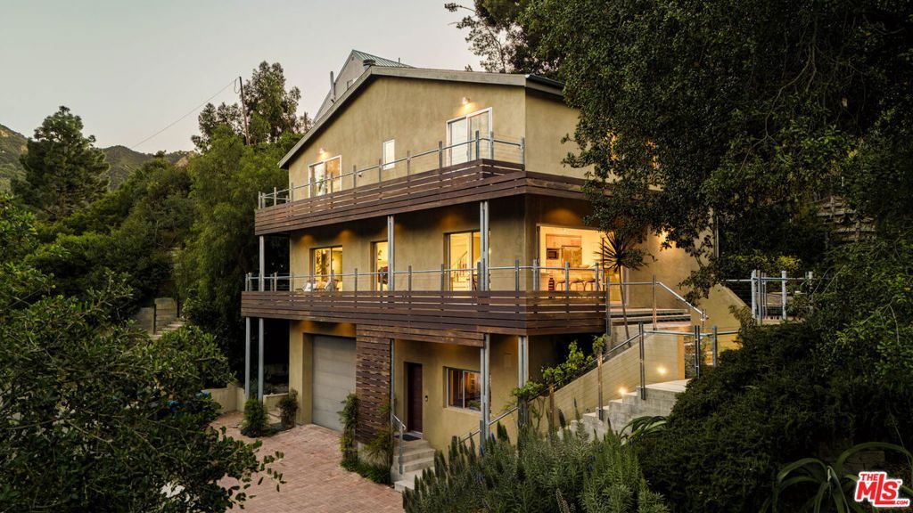 Nestled in one of Topanga Canyon's quieter pockets, this home offers an intimate connection to the surrounding canyon with views of Saddle Peak Ridge, where you can hear frogs in the creek and watch hawks soar overhead. Built by local builder Maurice Bourget and renovated in collaboration with architect John Jennings, the home spans three levels and is designed for easy indoor-outdoor living. The main level features a folding front entry and Fleetwood pocket doors that disappear completely, letting canyon breezes flow through the house and out onto the wrap-around balcony. The living room centers around a wood-burning fireplace, with windows framing the canyon on one side and the backyard hot tub on the other, while the kitchen is well-equipped with a six-burner chef's stove, wine cooler, walk-in pantry, RO and hot water tap. A guest bathroom on this level offers direct access to the backyard. Upstairs, skylights pour light into the hallway leading to three bedrooms. The primary suite looks out over the surrounding canyon with its own fireplace, en-suite bath, walk-in closet, and private balcony, a peaceful place to start and end the day. The second bedroom shares the balcony with the primary and has a charming view of the backyard, and the third bedroom has access to a deck leading out into the yard. Each room finds its own quiet connection to the landscape. The primary has its own en-suite bath, and a shared bathroom serves the second and third bedrooms. The ground level houses a theater room with projector and screen, and a full bath, equally suited as an office or guest suite, alongside an oversized garage with 20-foot ceilings. Outside, native landscaping surrounds a large brick patio with multiple seating areas connected by a walkway that winds through the backyard, with spots to sit, unwind, and take in the natural setting at every turn. The property comes with a 16-panel solar system, fully paid off. Just minutes from Old Topanga Canyon Road and about 15 minutes from Calabasas, this is a well-built, comfortable home in a beautiful part of the canyon, ready to be made your own.