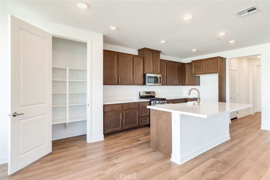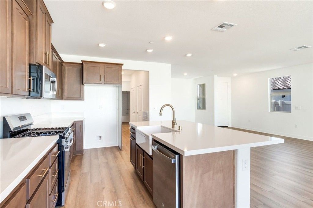 Move-in Ready Home! This beautifully appointed residence features a stucco patio cover, an 8 entry door, and thoughtfully selected interior upgrades throughout. The primary bath includes a fiberglass shower, while Bath 2 offers a fiberglass tub with a classic subway pattern. The kitchen is equipped with a GE 30 freestanding gas range appliance package with stainless steel microwave hood, Nutmeg shaker cabinets with satin bronze 7 bar pulls, Simply White quartz countertops, an upgraded champagne bronze pull-down faucet, and an upgraded Elkay white farmhouse single-bowl fireclay sink. Additional highlights include pendant light pre-wiring at the island, luxury vinyl plank flooring in common areas, carpeted bedrooms, and vinyl flooring in bathrooms and laundry. The covered patio is prewired for a ceiling fan, and the great room is flat-screen TV ready with conduit. Situated on a 5,887 SF lot.