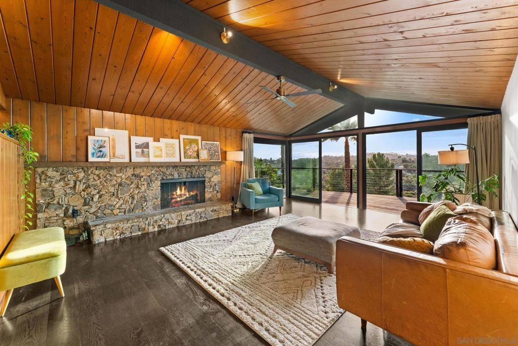 Mid-century modern hillside retreat with panoramic sunset and valley views. Extensively remodeled, this home blends timeless design with modern upgrades and seamless indoor-outdoor living. Vaulted wood plank ceilings and expansive glass bring in abundant natural light, while the living rooms stone fireplace opens to a wraparound deck?perfect for entertaining or enjoying San Diego sunsets. Designer kitchen with custom cabinetry, matte quartz countertops, brass hardware, statement backsplash, and premium KitchenAid appliances, including a concealed panel dishwasher. The primary suite features vaulted ceilings, engineered wood flooring, and direct deck access. Spacious bonus/flex room ideal for office, guests, or studio. Exterior highlights include Hardie siding, Milgard windows and doors, leased solar, drought-tolerant landscaping, fruit trees, and multiple outdoor living areas. Privately set in a natural setting yet just minutes from city amenities.