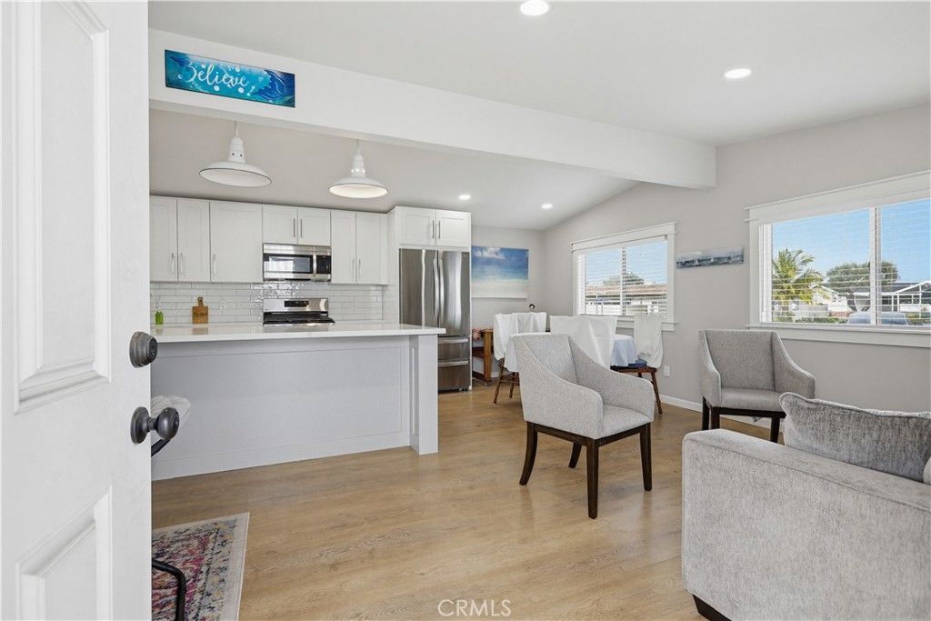 Located within a well-maintained Huntington Beach community, this residence offers a functional layout with updated interiors and convenient outdoor access. A covered two-car carport provides ample parking and includes an adjacent storage shed. A separate side entrance, framed by landscaping and a stepping stone pathway, leads into the home and continues toward a rear outdoor area with fruit trees. Inside, laminate flooring and a clean interior create a bright and well-kept living environment. The main living space features an open-concept design, combining the living and dining areas with a seamless transition into the kitchen. The kitchen is a central highlight, appointed with white countertops and cabinetry, upgraded LG appliances, recessed lighting, and a large center island with pendant lighting. A hallway off the main living area leads to the private living quarters. This includes a secondary bedroom with closet space, a full bathroom, and a primary suite with its own closet and an ensuite bathroom featuring an updated glass-enclosed shower. A dedicated laundry room is also located along this corridor and provides direct access to the carport for added convenience. With its updated finishes, efficient layout, and well-connected indoor and outdoor spaces, this home offers comfortable living in a desirable Huntington Beach location.