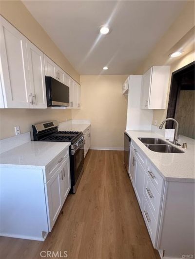Welcome to this fully updated Bellflower home where modern upgrades meet timeless character. This 2-bedroom, 1-bath residence showcases a remodeled kitchen with quartz countertops, white shaker cabinetry, stainless steel appliances, and a breakfast bar that opens seamlessly into the dining space The homes standout dining or second living area features exposed wood beam ceilings and a statement stone fireplace?adding warmth and unique architectural charm rarely found at this price point. Recent upgrades include new flooring, interior and exterior paint, updated fixtures, and a newer roof, making this home truly move-in ready. A long driveway leads to a detached 2-car garage with strong ADU potential, offering added flexibility and future income opportunity. The backyard includes a covered patio space, ideal for entertaining or creating your own outdoor retreat. Centrally located near major freeways, shopping, and dining, this home offers both convenience and long-term value in a strong Bellflower market.