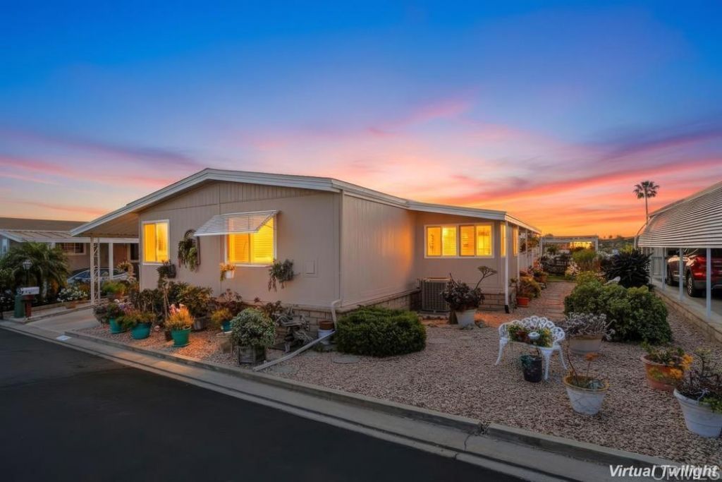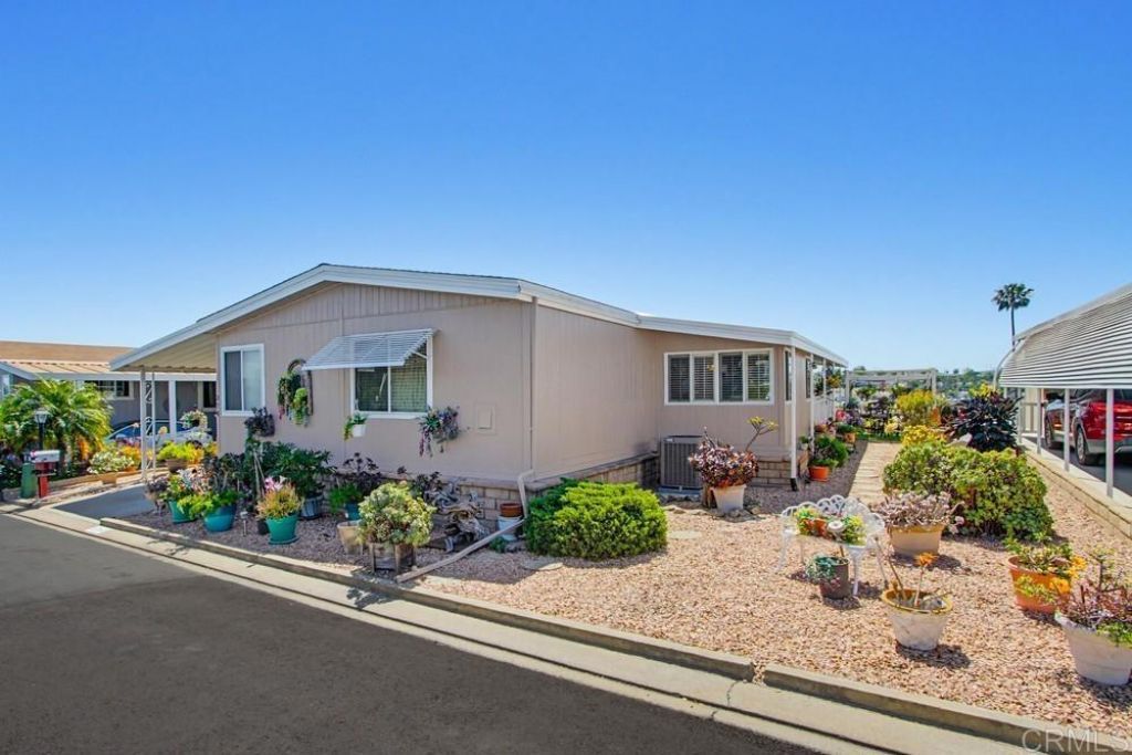 Ocean Views!!! Enjoy beautiful ocean views and sunsets at this home located in highly desired Palomar Estates West. The vaulted ceiling in the living and dining room make it feel very spacious. Wood laminate floors are located in the living, dinning and both bedrooms. The large California room can be used as an office, craft room, or grandkids play room. Enjoy the amazing ocean breezes from your front porch and large side yard.. This home is on registration which means NO PROPERTY TAXES. Palomar Estates West is a 5 star 55+/35+ senior rent controlled park with many activities and amenities including a beautiful clubhouse, pool, spa, gym, putting green, pickleball courts, and tennis courts. This home is located minutes to Lake San Marcos dining and golf as well as local Carlsbad beaches, shopping, and restaurants.