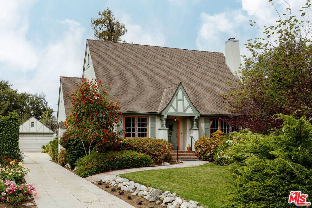 Nestled on an expansive 11,000 sq ft lot, this enchanting 2-bedroom, 2-bathroom Tudor-style home perfectly blends timeless architectural character with modern conveniences. From the moment you arrive, you are greeted by a large lot with manicured gardens and towering hedges that create a secret sanctuary, feeling worlds away from the hustle and bustle. The exterior's classic design invites you in, while the meticulously maintained interiors showcase the perfect blend of vintage charm and contemporary upgrades. Inside the living room you are greeted by lots of natural light, recently refinished original wood floors, a beautiful built-in shelf, a cozy fireplace and high ceilings. The spacious dining area is ideal for both everyday meals and entertaining. The kitchen boasts LG appliances, ample counter space, and plenty of natural light. The primary bedroom is a tranquil retreat, boasting a walk-in closet, en suite bathroom, and direct access to the back patio and pool through classic French doors. The outdoor area is a true oasis. Enjoy a coffee under the shade of the back patio, take a dip in the large pool adorned with majestic lion fountains, or catch some sun in the spacious and private back yard. The property has old growth fruit trees including a cumquat, pomelo, orange, lemon, avocado and few exotic plants like the Australian Grass Tree. The garage offers versatile bonus space that could be converted to an ADU, office or for use as storage. This property is in a quiet and serene part of Altadena with spectacular mountain views. It's just a short walk to Prime Pizza and minutes from Stater Brothers. This property is a quiet retreat that captures the very best of life in Altadena.