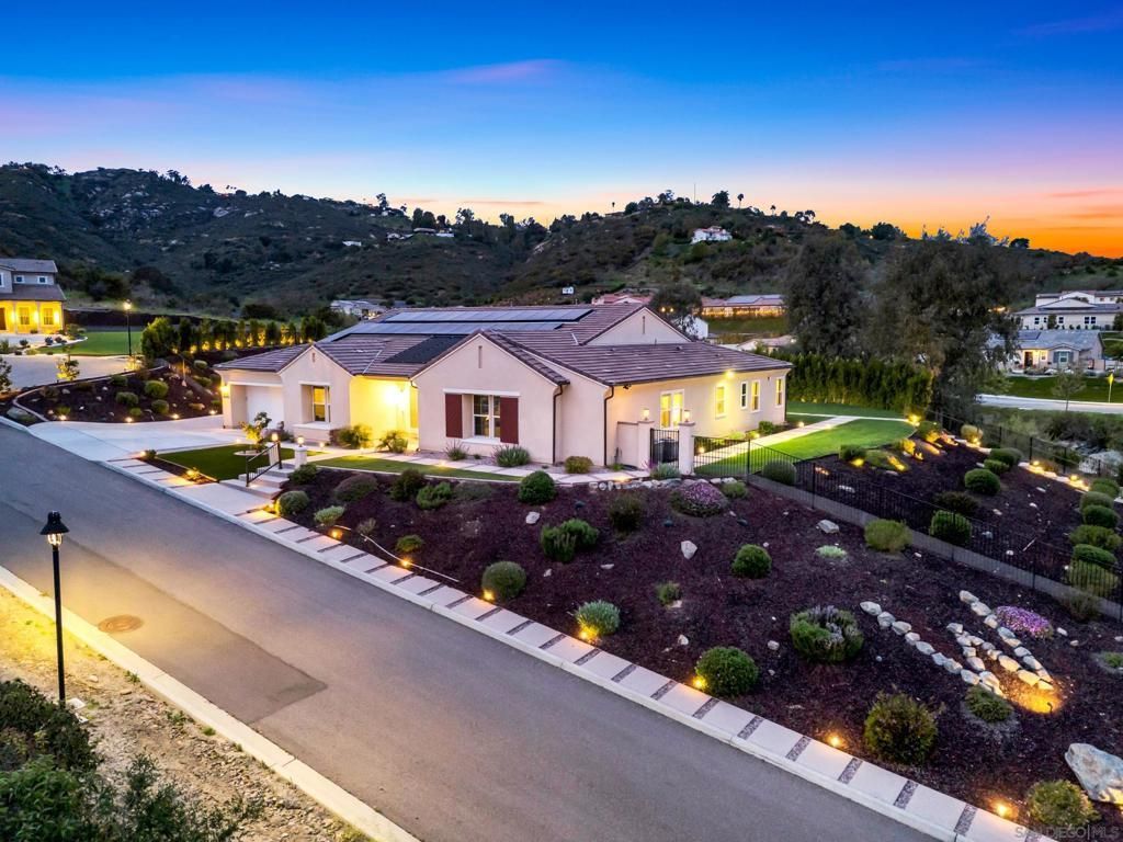 Exceptional single-story smart home on 1.5 private, view-filled acres, fully fenced and located on an elevated cul-de-sac with only two neighboring residences. This 2020 Lennar home features nearly $300,000 in resort-style landscaping, a saltwater pool and spa, and a dramatic fire-pit lounge with seating for 30?ideal for entertaining. Three-car garage with total parking for seven vehicles. Paid solar with Tesla batteries powers the estate and heats the pool/spa year-round. Elevated for sweeping vistas, privacy, and refined modern living. See supplement. Crafted for those who value privacy, luxury, and effortless indoor?outdoor living, this stunning single-story residence sits on beautifully landscaped grounds designed for true resort-style enjoyment. A custom saltwater pool and spa anchor the backyard, complemented by a dramatic fire pit with built-in seating for 30, a shaded pergola lounge, and a designer mobile outdoor kitchen for seamless al fresco dining. A gated side access with steps adds convenience and flow. Inside, soaring ceilings and natural light create an inviting, modern atmosphere. The great room features disappearing glass walls that blend into a stylish California room with fireplace, outdoor TV, and motorized shades?mirrored by automated window treatments in the living area. The chefs kitchen impresses with high-end stainless appliances, a large quartz island, custom cabinetry, and both butlers and walk-in pantries. The dining area frames picturesque views through floor-to-ceiling windows. Four ensuite bedrooms plus a flexible bonus room offer space for an office, studio, gym, or media room. The primary suite includes elegant molding, a spa-like bath with freestanding tub, dual vanities, a frameless shower, and a generous walk-in closet. California Closet built-ins enhance the primary suite, living room, and garage. Smart-home upgrades include voice-controlled thermostat, tankless water heater, Ring doorbell, paid solar (also heating the pool), Tesla batteries, EV pre-wire, generator, self-cleaning pool robots, LED lighting, dual A/C zones, alarm system, fire sprinklers, low-energy windows, and ceiling fans in all rooms. Yard is pre-wired for additional gas/electric and includes a turf pet area. The solar/battery system produces enough energy to power the home, heat the pool, and generate credits year-round. Harmony Grove Village amenities include a resort pool, spa, clubhouse, grilling areas, multiple parks, dog park, and over two miles of scenic trails for hiking, biking, and horseback riding.