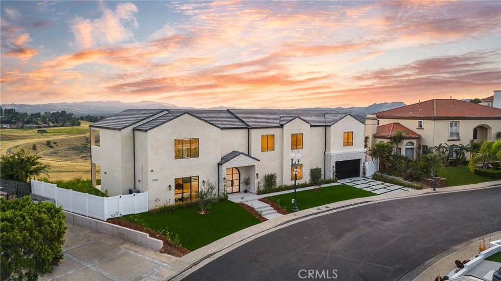 Presenting The Modern View Villa ? a rare opportunity to own a custom-built, brand-new estate in the prestigious guard-gated Summit Ridge community. Blending warm natural textures with refined modern design, this architectural masterpiece offers approximately 5,300 square feet of living space, featuring 5 bedrooms and 5.5 beautifully appointed bathrooms, all framed by breathtaking panoramic valley and city views. Step through grand custom wrought iron double doors into a striking entry that immediately sets the tone for this exceptional residence. Designed with both elegance and functionality in mind, the open-concept floor plan creates a seamless flow ideal for everyday living and upscale entertaining. The formal dining area showcases custom built-ins, while the expansive living room is anchored by a sleek modern fireplace and opens effortlessly to a one-of-a-kind European-style chefs kitchen. This culinary space is outfitted with a large center island, premium built-in appliances, and a hidden spacious walk-in pantry?perfect for hosting at any scale. Walls of sliding glass doors flood the home with natural light and create a true indoor-outdoor experience, opening to spectacular views and inviting outdoor living spaces. The luxurious primary suite is a private retreat, complete with a covered balcony, dual walk-in closets with custom built-ins, and a spa-inspired bathroom featuring natural stone finishes, designer fixtures, soft ambient lighting, and a serene, resort-like ambiance. Step outside to a resort-caliber backyard designed for ultimate entertaining, featuring a covered patio with built-in heaters, a custom outdoor BBQ area, and a stunning infinity-edge heated saltwater pool and spa?perfect for enjoying sunset views in total privacy. Additional highlights include soaring ceilings, wood flooring throughout, Italian tile finishes in bathrooms, a fully integrated surround sound system, security cameras, smooth stucco exterior, over 860sqft of covered patios and a three-car garage with direct access. Residents of this exclusive guard-gated community enjoy 24-hour security, private trails, and a peaceful, elevated lifestyle just minutes from premier shopping, dining, and entertainment (Westfield Mall & The Village At Topanga). A true escape within the city?private, sophisticated, and designed to impress.
