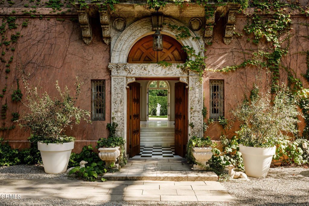 Secluded behind the original estate walls, noted architect Reginald Johnson's masterful recreation of a Tuscan villa is a surprise, sited on a flat one acre parcel in the quiet South Arroyo neighborhood of Pasadena and South Pasadena. Belying the ease of quick accessibility to downtown Los Angeles, Pasadena, and freeways giving universal access to LA's network, the property offers a convenient retreat from our busy world. The Italian Renaissance Revival villa is structured with inspiring historic detail, the work of original craftsmen brought from Italy to ensure old world quality. The double doors to the two-story entry hall lead to an initial gathering space with classical columns, scaled impressively for formal gatherings, while the honed marble floors and warm woods are equally comfortable with today's barefoot indoor outdoor lifestyle. Owned by Pasadena luminaries for nearly a century, the 5-bedroom, 5-bathroom primary residence features voluminous space and height throughout with tall Palladian doors and windows filling the rooms with beautiful light and air. Formal living room and adjoining library - both with fireplaces, and a formal dining room all have direct access to outdoor patios, captivating gardens and the expansive lawn beyond. Warm, inviting chef's kitchen with casual seating area and an adjacent butler's pantry, back kitchen storage/mudroom, separate laundry room, two bedrooms and bathroom complete the lower level. The second level is divided into two distinct zones accessed from the central landing. Luxurious primary suite - with separate bedroom, dressing and sun rooms and walk-through closet and bath. Opposite is an additional bedroom suite with bath ensuite and adjoining sitting room, as well as another large bedroom with bathroom and closet ensuite. Sequestered one bedroom guest house with living room anchored by a fireplace, kitchen, bedroom and bath - all surrounded by its own hedged gardens. Swimmers pool, spacious pavilion, spa retreat, hidden rose garden and dining area with fireplace and grill. Lushly landscaped with sweeping lawn, mature specimen trees, grape arbor, secluded refuges and several fountains. Generous parking area includes carport for multiple vehicles.