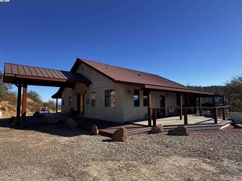 Panoramic Views, Privacy, And Convenience Only 1.5 hours from Yosemite! Welcome to 2280 Roan, a stunning 3-bedroom + office (optional 4th), 3-full bath home with two owner suites and 2,832 sq ft of beautifully designed living space. Offering 20 acres + a seasonal creek on end of road privacy, this retreat showcases sweeping mountain and lake vistas on a wraparound porch. Only 1.5 hours from Yosemite, about an hour from Bear Valley Skiing, 30 min from Murphys and 15 min from downtown Angels Camp, the home is designed to be fire resistant with concrete walls, fire-resistant floors and a copper roof. Inside, find a gourmet kitchen with stainless steel appliances, copper sinks, copper hood, monster island and granite countertops perfect for luxury entertaining. A cell tower on the opposite mountain ensures full reception throughout the property! Additional highlights include a walk-in wine cellar, a professional gun safe, owned solar, new water filtration / softening system for the whole house, tasteful décor with warm colors, and abundant natural light. The high-producing well, PG&E service and weekly city garbage pickup make country living effortless.