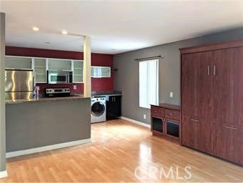 Gorgeous studio featuring space-saving Murphy bed and dedicated desk area. Includes one full bathroom, a convenient European-style washer/dryer combo, and a private 1-car garage.
