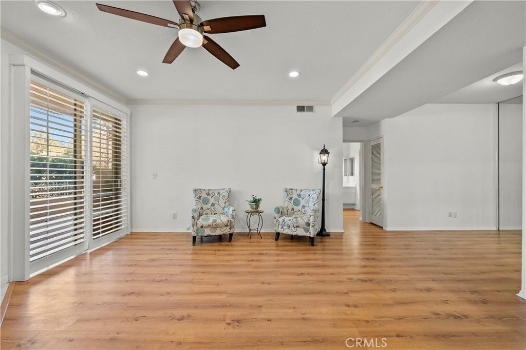 Feel right at home in this inviting 1-bedroom, 1-bathroom first-floor condo located in the highly desirable Santa Fe community in the heart of Valencia. This bright and welcoming home features a private patio, perfect for relaxing or hosting gatherings year-round. Inside, youll find a comfortable living spaces, including a cozy fireplace, crown molding, window shutters, recessed lighting, central heating and air, and an in-unit laundry closet for added convenience. The spacious bedroom includes a walk-in closet, while the bathroom offers a dual-sink vanity, creating a functional and comfortable layout. The property also includes a single-car garage plus an additional assigned parking space. Residents of the Santa Fe community enjoy resort-style amenities, including three pools and spa areas, beautifully landscaped grounds, and tranquil waterfall-inspired features. The community has also recently been updated with new asphalt in the parking areas and newly installed mailboxes (2025). Enjoy the scenic Valencia paseos?perfect for walking, biking, or simply enjoying the outdoors. Ideally located close to Valencias premier shopping, dining, and entertainment, this home offers both comfort and convenience in one of the areas most sought-after communities.