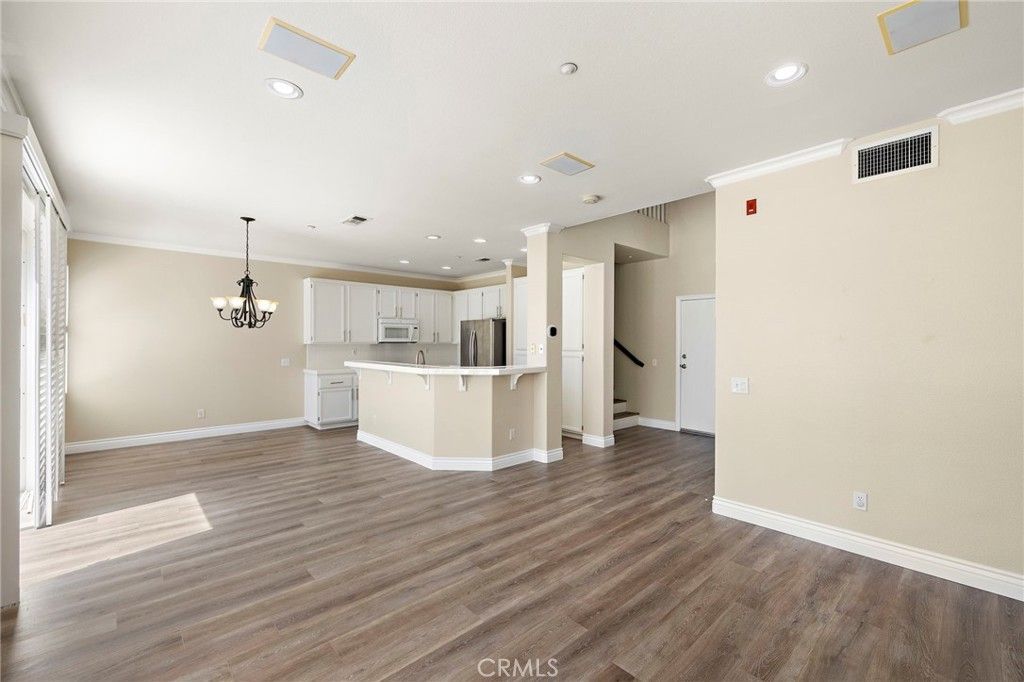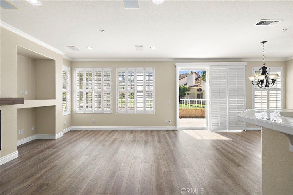 Presenting a meticulously updated townhome in the highly desirable, gated community of Village Niguel Garden in Laguna Niguel. This two-story residence features a charming tile roof and stucco facade, framed by mature privacy hedges for immediate curb appeal. Inside, discover a spacious, light-filled floor plan where crisp crown molding and elegant wood-look flooring extend throughout the main living areas, complemented by classic plantation shutters. The inviting living space connects seamlessly to a dining area with a modern dark-framed chandelier. Designed for style and function, the kitchen offers white shaker cabinetry, stainless steel appliances, and a gas range. A central peninsula with a double sink divides the kitchen from a cozy family room featuring a gas fireplace and custom built-in media center. Upstairs, find comfortable bedrooms with ample natural light, including a primary-style retreat in a relaxing blue hue. The private back patio is perfect for entertaining, with low-maintenance pavers and a built-in planter overlooking a lush community greenbelt. Highlighting modern efficiency, this home is equipped with a whole-home water softener and a dedicated electric car charger in the attached two-car garage.