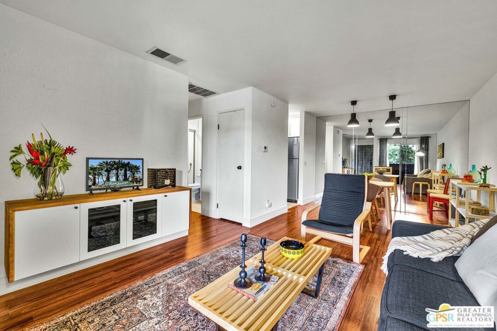 Modern Retreat. They say good things come in small packages, and this stylishly updated second-floor condo is the proof. Offering modern comfort in a perfectly scaled footprint, the interior features a custom floating media cabinet, sleek stainless appliances, and soft-close cabinetry that keeps the vibe fresh and organized. Significant upgrades provide total peace of mind, including a brand-new A/C system installed in the summer of 2025 and a remodeled bathroom complete with a classic black & white subway tiled shower and integrated niche shelf. The community feels like a desert sanctuary, where you can spend your days enjoying the sparkling pools, relaxing spas, and tennis courts set against a backdrop of mature landscaping and beautiful San Jacinto mountain views. For the outdoor enthusiasts, you are perfectly positioned near the CV Link, the Aerial Tramway, and world-class hiking trails, all while staying just minutes from the energy of Downtown Palm Springs. This home comes partially furnished and sits on Fee Land, making it easy for full-time living, a weekend escape or a savvy investment opportunity.