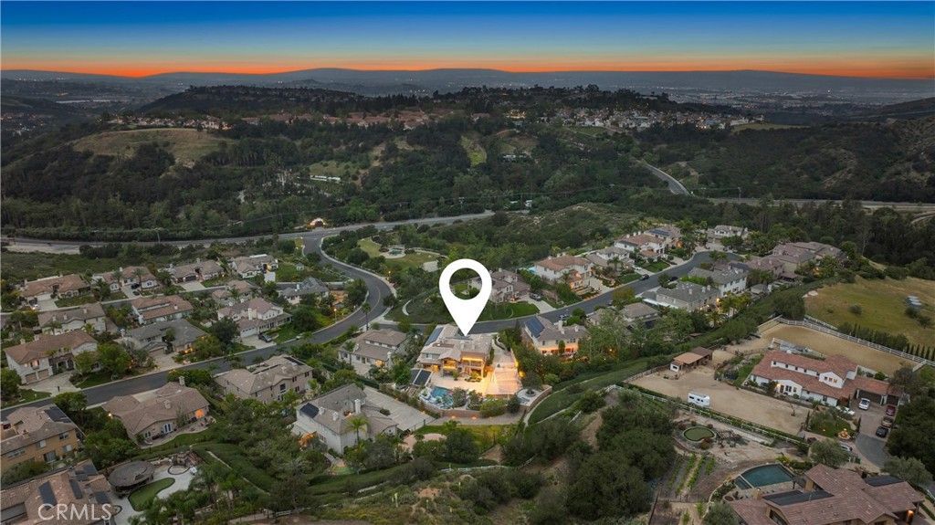 Tucked within Santiago Canyon Estates, this private resort-style home is designed around outdoor living, recreation, and entertaining, featuring expansive grounds with a rock pool, water slide, spa, and natural rock jumping ledge into a 10-foot deep pool, creating a private backyard retreat. Outdoor living areas include a fire feature integrated into the pool, a covered patio with built-in fireplace and heaters, and an upper seating area capturing canyon and hillside views, along with multiple seating and dining areas throughout the yard, plus a putting green, in-ground trampoline, and a sports court that can also be used for pickleball. The outdoor kitchen, built in 2019, includes a built-in BBQ, smoker, pizza oven, ice maker, microwave, soft-close cabinetry, heaters, sunshade and windscreen, full-size refrigerator, and refrigerator drawers, forming a fully equipped outdoor kitchen and entertaining space, while the backyard also includes two outdoor bathrooms, an outdoor shower, and 16 fruit trees throughout the property. The home opens to an interior featuring handcrafted hardwood flooring, custom crown molding with integrated recessed lighting, plantation shutters, built-ins, and multiple living and bonus rooms. The layout includes elevator access to the second level, a main floor bedroom and bathroom, and a separate staircase leading to a second wing, providing flexible space for guests, office space, or multi-generational living. The large family room is anchored by a massive fireplace and opens directly to the outdoor kitchen and covered entertaining areas with tile flooring that seamlessly transitions from the interior to the covered outdoor space, creating true indoor-outdoor living. A spacious dining area sits between the kitchen and family room, ideal for entertaining, and the kitchen features Taj Mahal quartzite countertops, two-tone cabinetry, a large center island, walk-in pantry, refrigerator drawers, full-size refrigerator, and two microwaves. Additional features include paid solar, whole house generator, EV charging, new windows and doors, water purification system, luxury HVAC, three tankless water heaters, upstairs and downstairs laundry rooms, and RV storage on site, creating a home designed for private resort-style living in Santiago Canyon Estates near hiking trails, outdoor recreation, and Orange County shopping, dining, and coastal destinations.