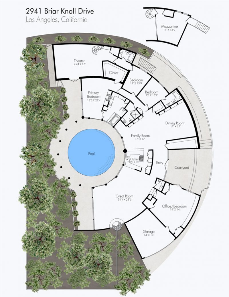 TEMPO HOUSE RAY KAPPE, 1959. Little has been written about this extraordinary residence due to its history of ultra-private ownership, yet it remains a property of remarkable architectural pedigree. With original plans archived at the Getty, the Tempo House represents a rare departure from Kappe's more widely recognized body of work. Since 1977, the home has been owned by prominent Hollywood figures Chuck McCann and Betty Fanning. Built around a stunning circular pool with an oculus overhead, the home is centered on a dramatic architectural focal point, with all principal rooms oriented to embrace this striking feature. In the early 2000's, the residence was expanded by architect Gus Duffy, seamlessly enhancing the original design while preserving its integrity. A dramatic two-story movie theater serves as a true centerpiece of the home, designed for both cinematic viewing and live entertainment. The upper level offers additional flexibility and can be utilized as a recording studio, creative workspace, or private production suite. The home features 3 bedrooms plus an office, including a primary suite overlooking the outdoor pool area. Tucked away in a quiet highly coveted celebrity enclave, the property offers exceptional privacy along with serene city, canyon, and hillside views. A compelling and unique offering!