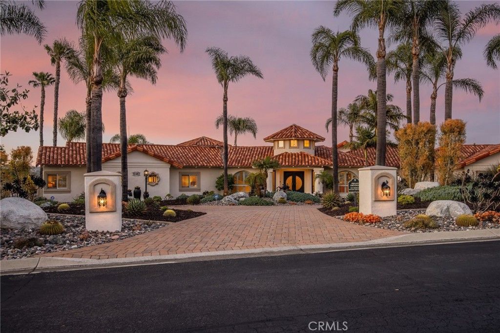 Perched at the farthest point along the hillside above the renowned San Luis Rey Downs Racetrack in the gated community of Lake Vista Estates, this exceptional residence captures sweeping panoramic views of the San Luis Rey Valley toward distant mountains. The setting evokes the beauty of a Tuscan countryside?where mornings begin with sunrise coffee on the terrace and you can watch the horses train and trot along the track below. Thoughtfully designed to maximize both views and livability, the home offers a flexible floor plan that lives comfortably as a 4-bedroom home?each with its own ensuite bath?plus a dedicated office privately positioned in a charming turret with elevated valley views. A grand Mediterranean-style entry introduces the homes architectural concept of sequential framing, guiding the eye through elegant openings from the formal dining room to the living spaces and onward to surrounding vistas. The bespoke primary suite serves as a luxurious retreat featuring an imported Italian marble fireplace, French doors opening directly to the pool terrace, dual walk-in closets, and a spa-inspired bath with split vanity sinks, heated floors, a multi-jet soaking tub, and steam shower. An oversized laundry room with abundant cabinetry provides excellent storage. Refined craftsmanship is showcased throughout with marble and hardwood flooring, exposed beams, Venetian plaster walls, and distinctive turret architecture with soaring dome-vaulted ceilings. The chefs kitchen features a generous breakfast nook, oversized marble-topped island with a new Miele induction range, Sub-Zero refrigerator drawers, walk-in pantry, and custom cabinetry designed for both display and convenience. The adjacent family room offers generous scale with a fireplace, built-in hutch, and media wall. Outdoors, the meticulously landscaped grounds create a resort-like setting with privacy from neighbors on a forward extended patio. The landscape boasts drought-conscious succulent gardens, a rose garden, sleek glass fencing, and a newly resurfaced pool accented by a natural stone waterfall. A built-in BBQ with bar seating invites effortless entertaining, while expansive patios provide the perfect setting to enjoy the homes extraordinary views and tranquil surroundings. A spacious three-car garage includes additional storage cabinets and an EV charging station. This is elevated living?where luxury, comfort, and peaceful scenery converge into a dream fulfilled.