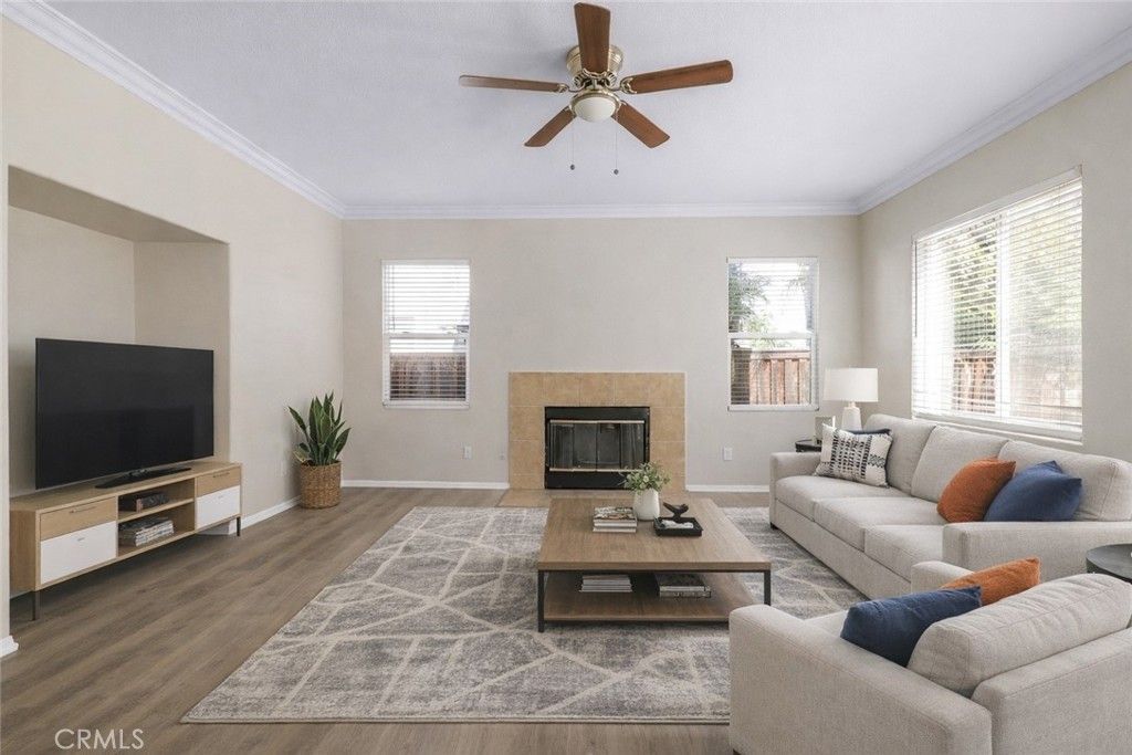 5 bedrooms and 3 baths two story home located in the Mapleton Community in Murrieta. This 2585 square foot home was built in 2002 and sits on a 6098 sqft lot with an amazing easy to maintain yard with an attached 2 car garage with direct access inside the home plus an extra attached single car garage for 3 total grage spaces. This home has been well taken care of throughout, with upgrades that include laminate wood floors and a light color paint scheme to bring lots of natural light, and ceiling fans throughout most of the home. When you enter the home, you are met with a hallway that leads to the spacious living room, featuring a fireplace and an open concept that connects with the kitchen. The kitchen features stainless steel appliances that include a free standing range, dishwasher and built in microwave. The kitchen is highlighted with quartz counters with kitchen island, a stainless steel double sink, recessed lighting and a ton of cabinet and counter space. Next to the kitchen, you will find the laundry room with washer and dryer included and more cabinet storage. Just off the kitchen, you will find the formaldining room with a chandelier overhead. Downstairs, you will find one of the bedrooms as well as a full bath. Once upstairs, the first bedroom is the primary suite. The primary suite features a a double door entry leading in the room. The room itself is quite large. The walk in closet features sliding doors and once inside there are shelves and plenty of room for storage. The primary bath has double sinks, soaking tub, and separate shower. The rest of the bedrooms are located down the hallway and are all provided with sliding door closets, ceiling fans and lots of natural light with a third full bathroom centrally located between the remaining three bedrooms. The backyard of the home is very large with plenty of room to customize, add a pool, and more. It currently has very easy to maintain landscaping while still offering a large concrete patio perfect for entertaining. This home is conveniently located close to grocery stores, restaurants and easy access to the 215 freeway.