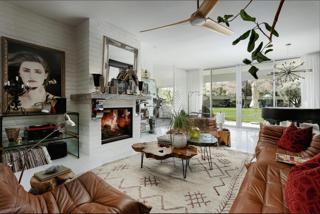 Perched on an elevated site with sweeping views across the 10th and 11th fairways toward the prestigious Southridge estates, this exceptional 3-bedroom, 3-bath expanded residence offers one of the largest and most desirable floor-plans within Seven Lakes Golf & Country Club.Blending iconic mid-century modern design with refined contemporary finishes, the home impresses from the moment you enter. The living room, anchored by a bespoke fireplace, opens to lush green vistas and a private leisure terrace finished in handmade terrazzo tile--perfect for elevated indoor-outdoor living.The European-style kitchen features quartz countertops, a striated tile backsplash, and top-tier appliances including a Sub-Zero 48 refrigerator, Wolf induction range, and Cove dishwasher, complemented by a sunlit breakfast room, perfect for casual dining or a work from home space. Designed for effortless entertaining, the expanded layout includes a custom built-in bar and a striking media lounge with a dramatic Japanese Yakisugi wood accent wall. Privately tucked away, the bedroom wing offers a tranquil retreat, highlighted by a luxurious primary suite with custom jute carpeting and a spa-like bath finished in Italian white marble, complete with a rain shower and Victoria + Albert soaking tub. A versatile secondary bedroom with a Murphy bed adds flexibility for guests or a refined den space.Thoughtfully upgraded throughout, the home includes owned solar, EV charging, updated roof and electrical, dual-pane Fleetwood sliders, a Trane HVAC system, whole-house water filtration with de-ionization and an instant hot water system.A private garage completes this perfect picture. Centrally located, this Richard Harrison-designed villa is just a short stroll to the iconic William Cody clubhouse, offering fine dining, a vibrant social scene, views of the signature fountain and the Ted Robinson designed 18 hole golf course. Within Seven Lakes' 24-hour guard-gated community, you can enjoy the ease of living with complete peace of mind--making this an ideal full-time residence or effortless desert retreat.