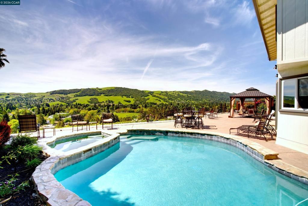Million dollar valley views! Rarely does a home of this caliber come to market. Impeccably maintained with an extraordinary level of care, this stunning residence offers refined living. Showcasing four bedrooms and three full baths, including a highly desirable main-level ensuite. This home is filled with natural light and timeless architectural detail. Expansive living spaces are enhanced by beam ceilings wrapped in crown molding, custom built-ins and a gas fireplace with electric start-creating a warm yet sophisticated ambiance. The heart of the home, features white cabinetry, granite countertops, a generous center island with seating for six to eight, dual stainless steel sinks and a six burner professional grade gas range/oven. The luxurious primary suite is a peaceful retreat, highlighted by four skylights, walk-in closet and an opera-style terrace that adds architectural charm. The rear of the home unveils it's most extraordinary feature--breathtaking180 degree view of Las Trampas hiils, creating a stunning backdrop with a spa that spills into the solar heated pool, while the downslope reveals a charming vineyard adding a touch of wine country living. Well-appointed laundry offers buit-in storage and deep basin sink. Close proximity to top-rated schools, parks & playground