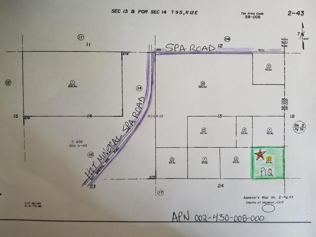 Niland, Ca. Just NE of Bombay Beach. 40 acres More or Less located SE'ly of Hot Mineral Spa Rd & Spa Rd near the fountain of youth spa N of Hwy 111. Zoned S-1-RE. which allowes for many potential uses including Renewable Energy. You own the Land, No HOA's. Surrounded by Hot Mineral Spa's local in the area as well as very popular neighboring town of Bombay beach just minutes away. Perfect for the investor buld your farm, winter getaway or family compound. Lat: 33.85097 Long: -115.66695 APN 002-430-008-000 IMPERIAL COUNTY.