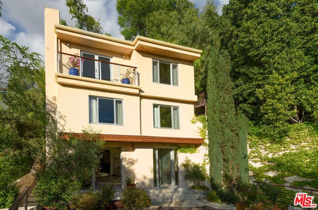 A Sanctuary Above the City! Tucked into the wooded hillsides of Woodland Hills, this thoughtfully reimagined modern Mediterranean retreat offers something increasingly rare in Los Angeles: genuine seclusion, lofty views, and the quiet drama of mature trees and open sky, all just minutes from the boutique dining and culture of Ventura Boulevard, and a breathtaking canyon drive to the coast. Renovated from the ground up by two artists, custom walnut interior doors and a wood-burning fireplace framed in elegant fluted marble tile set a tone that is warm and refined, while generous stone-look tile on the ground floor gives way to engineered oak hardwood on the levels above. Light pours through newer triple-paned windows and an extra-high sliding door that opens the living and dining spaces to the outdoors, dissolving the boundary between inside and out.The kitchen has been completely reimagined with a solid marble tile backsplash, quartz countertops, warm modern finishes, underlit cabinetry, and a generous pantry - a beautifully functional space, with a glass door opening directly to the rear patio. A discreet powder room completes the ground floor. The second level opens into a book-lined screening room, pre-wired for Dolby 5.1 and finished with custom floating cabinetry purpose-built for media - a space equally given to cinema and quiet reading. Beyond, a hallway leads to two spacious bedrooms with scenic outlooks and custom built-in closets with glass sliding doors, a full bath, and a generous laundry room with ample storage. The larger bedroom has a corner gas fireplace with a modern fire-glass bed as does the primary suite above. The stairwell opens to a sweeping picture window, drawing light through the home and framing a burst of bougainvillea as you arrive at the primary suite - reserving the entire top floor. This elevated retreat offers panoramic mountain views, its own fireplace, a Juliette balcony facing the setting sun, and custom maple ply cabinetry with generous his-and-hers walk-in closets. The spa-like primary bath features custom floating cabinetry and a soaking tub positioned to face the western light. Outside, the landscaping reflects the same artistic sensibility as the interiors. Tall walls with a cascade of lush climbing foliage frame the approach, creating a sense of verdant seclusion as you arrive at the wide front steps. Beyond, Mediterranean plantings - olive trees, fragrant herbs, drought-resilient perennials - create a garden sanctuary that feels far removed from the city below. A bespoke steel-lined fire pit and seating area anchor the rear deck, surrounded by mature plantings and the sound of birds. With convenient freeway access, it is a home for people who want to be in Los Angeles without being consumed by it.Additional features include central HVAC, recirculating hot water system, attached two-car garage with storage loft, and three exterior utility closets. This house is easy to call HOME!!!