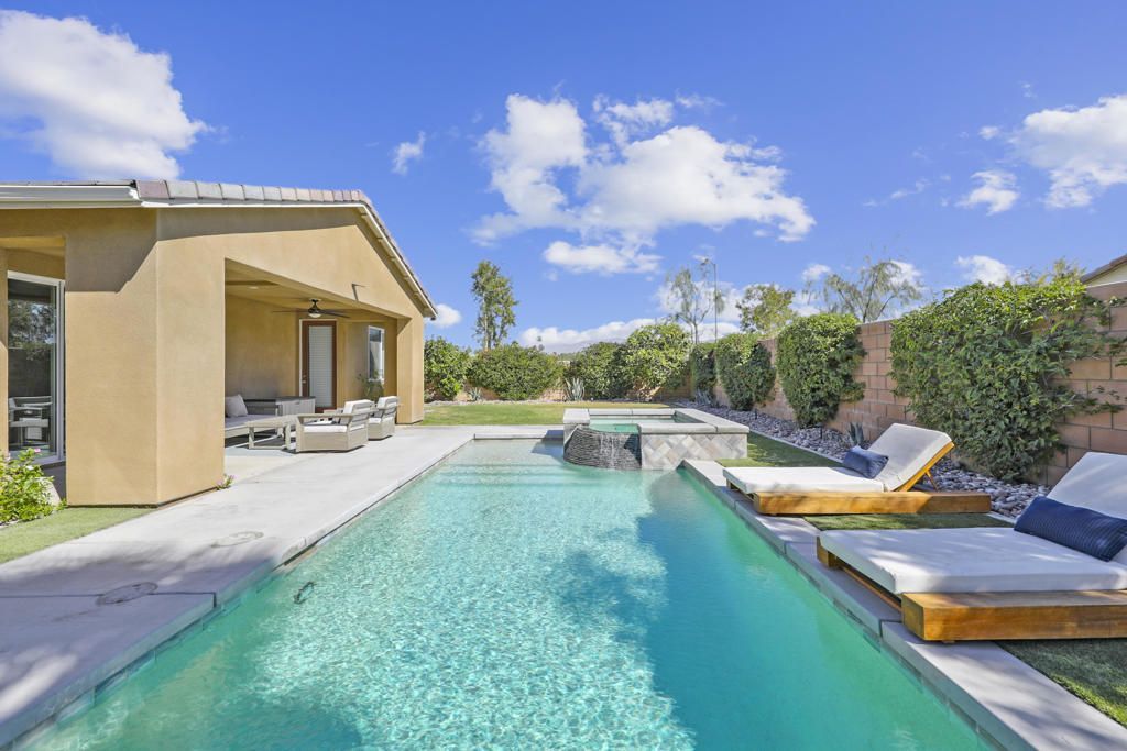 Welcome to Yorkville in Bermuda Dunes, where opportunity rarely knocks twice. This beautifully maintained 2018 residence sits on an expansive 8,000+ sq ft lot, offering privacy, space, and exceptional value in one of the area's most desirable communities. Designed for both comfort and entertaining, the backyard is a true retreat. Enjoy a saltwater PebbleTec pool, elevated infinity-edge spa, lush real grass and artificial turf, all creating the perfect setting for gatherings, pets, or play. There is plenty of room to host, relax, and savor the desert lifestyle.Inside, the home is light, bright, and airy with polished stone tile flooring throughout and carpet in bedrooms. The chef's kitchen features sleek quartz countertops, a spacious island ideal for entertaining, and high-end finishes that elevate everyday living. Most furnishings are included, showcasing quality pieces from Arhaus, West Elm and other premium brands, allowing for a seamless move-in experience.Homes in Yorkville are seldom available, and this one combines location, upgrades, and value in a way that is hard to match. If you have been searching for a refined, turnkey property in Bermuda Dunes with low Hoa's this is a must see. Call today!