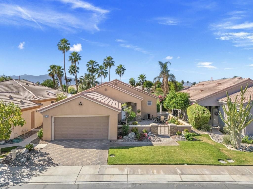 Offered in the sought-after Heritage Palms Country Club, this upgraded residence delivers a perfect balance of relaxed desert living and refined design. From the moment you arrive, the home stands out with its stone-accented exterior, paver driveway, and inviting courtyard. Inside, the main living area is designed for easy living and entertaining, featuring oversized tile set on the diagonal, elevated baseboards, a custom media built-in, and an abundance of natural light. Recent updates include new paint, new carpeting in all bedrooms and new window coverings throughout, adding a clean, cohesive finish. The kitchen is both functional and stylish, appointed with rich custom cabinetry, slab granite counters with a streamlined single-level island, stainless steel appliances, and modern pendant lighting that anchors the space. Both bathrooms have been refreshed with a contemporary touch, showcasing walk-in tile showers, updated vanities, stone countertops, and upgraded fixtures. Outdoors, the backyard is designed to take full advantage of the surroundings, with a generous covered patio featuring flagstone detailing, an Alumawood structure, built-in BBQ, and open views across the fairway to the mountains beyond. Major systems have been addressed with a newer A/C and water heater, and the garage includes the added convenience of a laundry sink. Residents of Heritage Palms enjoy access to a premier 55+ lifestyle, including championship golf, resort-style pools (indoor and outdoor), pickleball and tennis, a full fitness center, clubhouse dining, and an active calendar of social events.