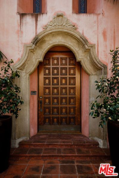 Grand-scale 1928 Spanish villa with a distinct Moorish flair, rich in original detail and unforgettable character. Privately gated and secure with cameras, this romantic Los Feliz residence features one of the most dramatic baronial entry staircases you'll ever see, complete with stained glass windows and a minstrel's balcony. The spectacular step-down living room showcases vaulted beamed ceilings, a fireplace, arched windows, and inlaid pegged wood plank floors. A beautiful formal dining room overlooks the lushly landscaped gardens and pool, while the gourmet kitchen with center island and walk-in pantry opens to a sunny, private patio. The den/family room offers a coffered ceiling, fireplace, and custom cabinetry. Throughout the home are graceful arches, French doors and windows, decorative ironwork, recessed shelving, balconies, original bath tile, and period fixtures and finishes. Three bedrooms and an office are upstairs, including a spacious primary suite with ample closet space and a lovely balcony, plus one bedroom downstairs. A rare and beautifully maintained romantic Spanish town villa with huge rooms, timeless elegance, and extraordinary architectural presence.