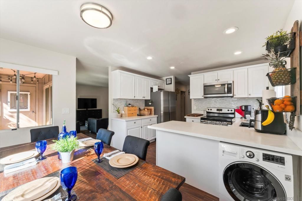 Welcome to this updated 2 bed, 2 bath first-floor condo offering nearly 1,200 sq ft of comfortable, open living. Features include LVP flooring, quartz counters, and a well-appointed kitchen with stainless appliances and an in-unit washer/dryer combo. Security cameras included. Assigned parking with potential for a second space (HOA). Enjoy a private patio overlooking a green canyon for added privacy. Community amenities include a pool, spa, and clubhouse, all conveniently located near SDSU, trolley access, shopping, and dining.