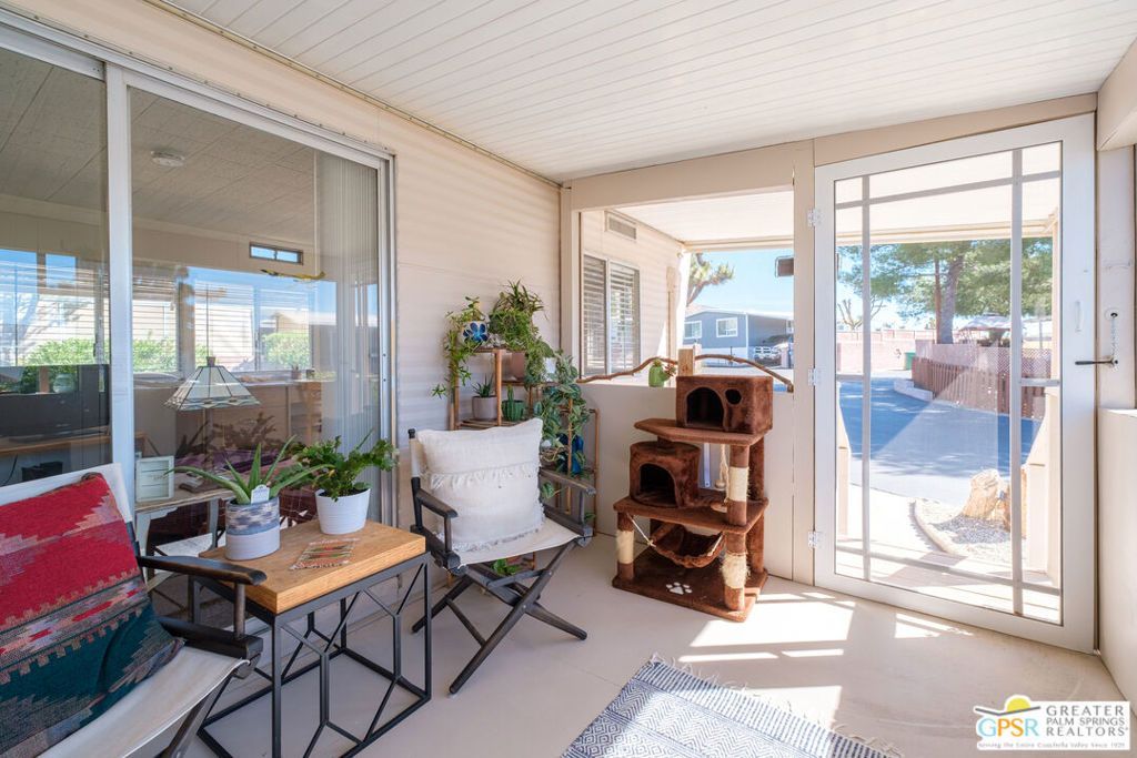 Welcome to Your High Desert Retreat! Step into a vintage gem that beautifully marries mid-century charm with an artsy, zen vibe, all within a welcoming 55+ community. This one-bedroom Vagabond home is a haven for creatives and dreamers alike, basking in diffused light that fills every corner with warmth and inspiration. The bedroom boasts ample built-in closets and drawers, maximizing storage while preserving the vintage aesthetic. The kitchen features era-appropriate cabinetry paired with updated appliances, ensuring you can whip up your favorite avocado toast with ease! Delight in original touches like the whimsical over-the-sink light and retro wall clock that add character and nostalgia. A sunroom enhances the allure of this home, currently serving as a cozy family room and artist's studio - a perfect sanctuary for creativity! The front entry lanai, complete with a screened-in porch, welcomes you with newer steps and a charming landing that leads into your personal oasis. Nestled on a corner lot, this impeccably maintained home features a spacious outdoor area complete with two storage sheds (one attached to the carport and has laundry hookups!) With convenient access to Yucca Valley shopping, Pioneertown and Joshua Tree, plus just a short drive down the hill to the vibrant scene of greater Palm Springs, this retreat is ideal for both full-time living and seasonal escapes. Hiking and golf are convenently nearby. Embrace the desert lifestylewhere mid-century elegance meets artistic spirit, all in a friendly 55+ community!