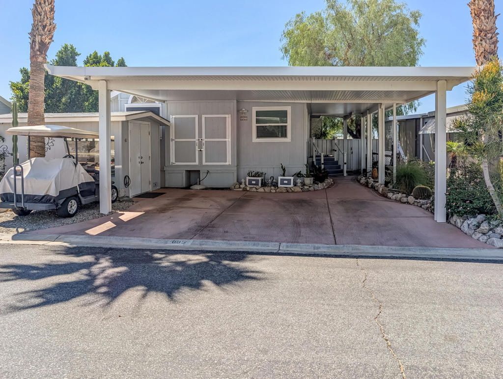 This extensively renovated 2-bedroom, 1-bath park model home encompasses approximately 800 square feet and features impressive mountain views along with pristine water features, situated on the 4th hole of the golf course. The property includes a well-designed two-car covered carport and golf cart, complemented by a California room constructed with quality craftsmanship and tasteful updates throughout, such as granite countertops, dishwasher and updated plumbing. Additional recent improvements include updated flooring, an upgraded HVAC system, a new hot water tank, appliances, and ceiling fans. The spacious covered deck and private yard are ideal for entertaining or relaxation, and an outdoor heater provides comfort on cooler evenings. Located within the premier 55+ Caliente Springs Resort, residents enjoy access to exceptional amenities including a mineral hot spring-fed pool and spas, a state-of-the-art fitness center, a 9-hole golf course, eight pickleball courts, tennis courts, laundry facilities, a library, and a vibrant community environment. Space rent is $950 per month; lot ownership is not included.