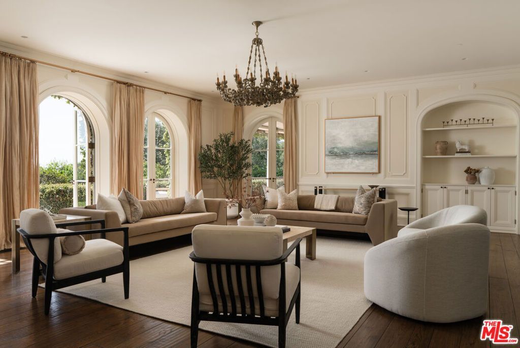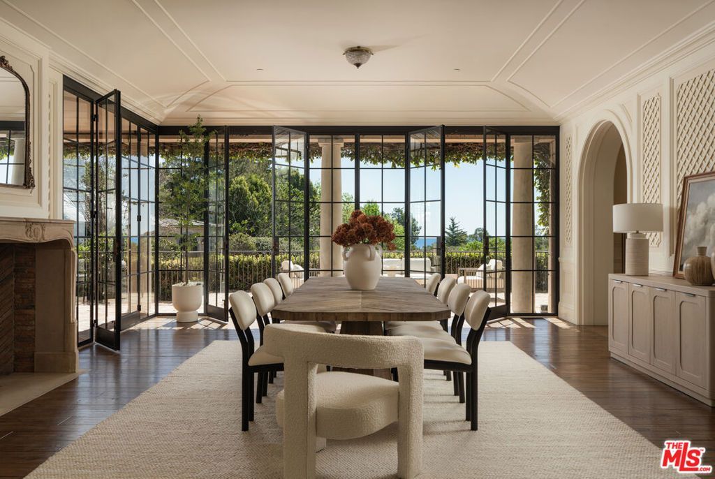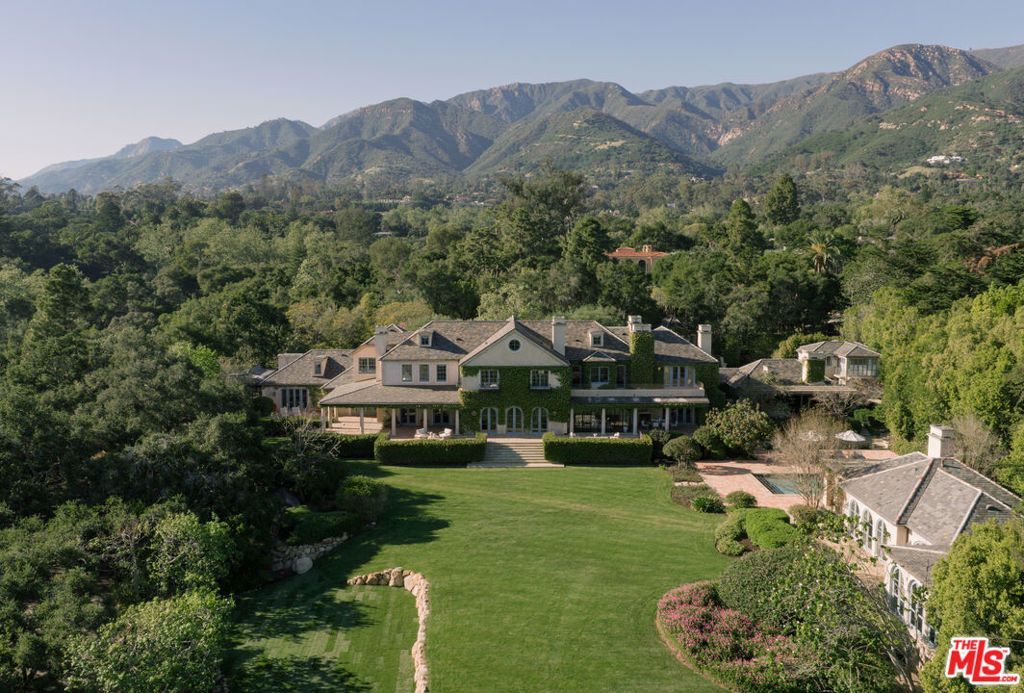 The main residence serves as the anchor of the compound, where a seamless flow between formal and informal spaces creates an environment of understated elegance. Large-scale windows and steel-framed doors invite the surrounding landscape into every room, flooding the interiors with soft, natural light. In the great room, towering ceilings and massive masonry fireplaces provide a sense of permanence, while the use of organic materials such as reclaimed wood, hand-finished plaster, and artisanal stone add a layer of warmth. The kitchen is a triumph of both form and function, featuring a minimalist design that hides the professional-grade capabilities of its high-end appliances. It is supported by a secondary catering kitchen specifically designed for high-level entertaining and seamless staff service. The primary suite is a true sanctuary, occupying a dedicated wing designed for absolute seclusion. This retreat features a private terrace that overlooks the Pacific, a cozy fireplace, and a spa-inspired bathroom finished in rare marble. Central to this wing is a bespoke dressing suite of gallery-like proportions, offering meticulously crafted storage and lighting to showcase an extensive collection. Additional bedrooms are equally well-appointed, providing guests and family with en-suite baths and framed garden views. Throughout the home, thoughtful detail enhances the sense of refinement, creating an atmosphere of understated luxury. Beyond the main house, the grounds unfold into a series of curated outdoor rooms. A sun-drenched pool and cabana provide a resort-style experience, perfect for summer afternoons against the backdrop of the mountains. Citrus orchards and manicured lawns are connected by winding stone paths that lead to the ancillary structures that include a fully equipped guest house and a creative studio. An impressive auto gallery caters to the serious collector, offering a climate-controlled environment that doubles as a showroom. With a guard house at the entrance and state-of-the-art infrastructure, the estate functions with total efficiency and security, offering a private world of unparalleled beauty.