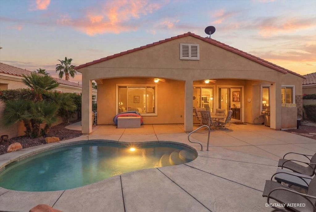 Imagine waking up in a community designed for an active and connected lifestyle, where golf, fitness, and social activities are part of everyday life. Welcome to this beautifully upgraded Avalino floor plan located in the highly sought-after 55+ community of Sun City Shadow Hills. Offering approximately 1,763 square feet, this thoughtfully designed home provides comfort, privacy, and flexibility with 2 bedrooms, 2 bathrooms, and a versatile den that works perfectly as a home office or optional third sleeping area. The floor plan offers excellent bedroom separation, creating a sense of privacy that many buyers appreciate. At the center of the home, the bright open kitchen flows seamlessly into the great room and dining area, making it ideal for both everyday living and entertaining. Features include stainless steel appliances, a granite center island, and a walk-in pantry. Ceramic tile flooring runs through the main living areas, while the den showcases custom wood flooring, and the home is finished with tasteful custom paint throughout. Step outside and discover what truly sets this property apart. The backyard has been designed as a private retreat featuring a spool with a rock waterfall, BBQ area, extended patio, and even an outdoor shower perfect for relaxing or entertaining under the desert sky. Additional advantages include location within the IID utility district, helping keep energy costs lower, along with turnkey furnishings and newer appliances, including the dishwasher, washer, and dryer. Residents of Sun City Shadow Hills enjoy access to golf courses, resort-style pools, fitness centers, pickleball and tennis courts, and a wide variety of social clubs and activities that make this community one of the most vibrant active-adult neighborhoods in the Coachella Valley.
