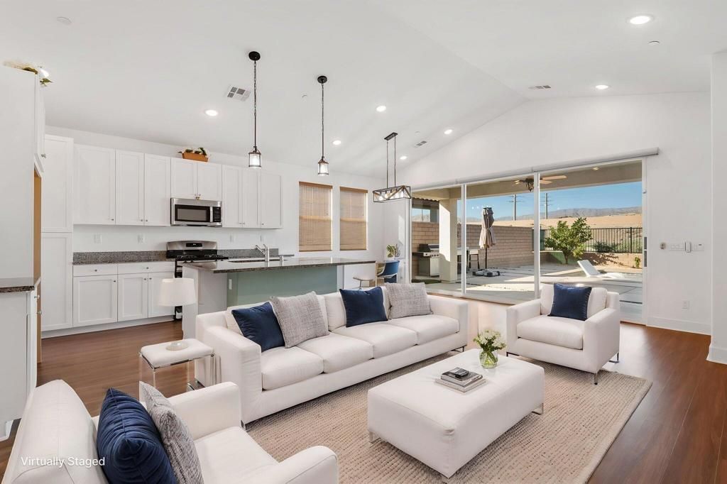 Beautiful move-in ready home in one of Indio's most sought after gated communities! Built in 2023, this spacious, light and bright home offers seamless indoor/outdoor living with a collapsing wall of glass that opens to the resort style saltwater pool and expansive views. This home lives like a single story with a FIRST FLOOR PRIMARY SUITE! Boasting two iiadditional bedrooms, PLUS a dedicated OFFICE with Murphy bed and an upstairs LOFT area for even more flex space. There's even a dog run! This beautifully upgraded property features money saving leased solar and an EV charger in the garage. As an added bonus, this home offers excellent potential as a short term rental investment (subject to HOA rules). Comfort, style and security all reside at 84112 Caviano Drive and now, you can too!