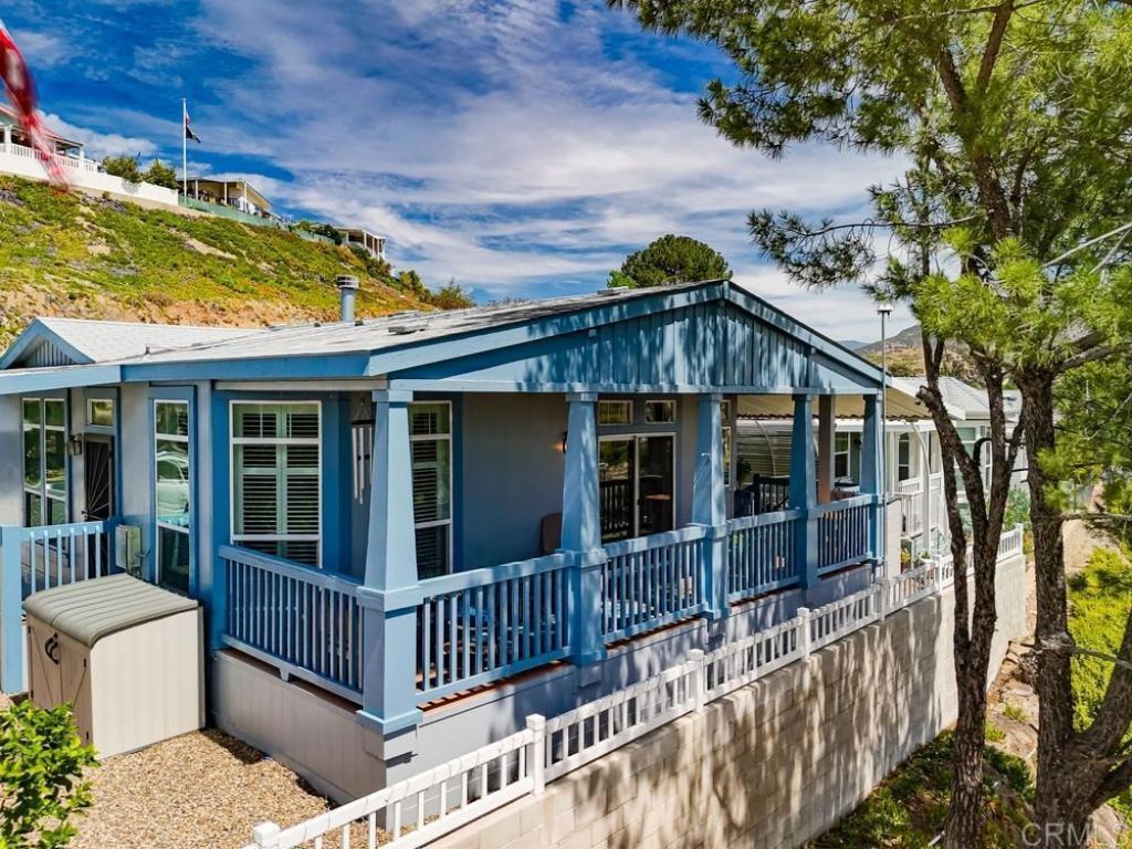 WELCOME HOME! Perched to capture an exceptional view of the surrounding mountains and valley, this beautifully maintained home offers a lifestyle that feels both peaceful and inspiring from the moment you arrive. Light pours in through tall shuttered windows, creating a warm and inviting atmosphere throughout the open-concept living space, where the kitchen, dining, and living areas flow effortlessly together. The kitchen is thoughtfully designed with stainless steel appliances, abundant cabinetry, pantry storage, and a large center island that naturally becomes the heart of the home. The living room features vaulted ceilings and a cozy fireplace, perfectly framing the stunning views beyond. The spacious primary suite offers a true retreat with a walk-in closet and a beautiful en-suite bathroom designed for comfort and relaxation. Step outside to enjoy multiple outdoor living spaces including a private secret garden, a low-maintenance fenced front yard, and an expansive covered deck where you can relax, entertain, and take in the scenery year-round. Additional highlights include paid-for solar, indoor laundry, a large storage unit, a covered carport with extended driveway, and a convenient lift providing easy access to the home. A golf cart is also available, adding to the ease of enjoying this vibrant community. Located in the highly desirable gated 55+ community of Lake Jennings Park Estates where you own the land and enjoy low HOA, residents have access to resort-style amenities including a clubhouse, pool, spa, fitness center, and more, all just minutes from Lake Jennings, hiking trails, shopping, dining, and a short drive to both the beaches and mountains.