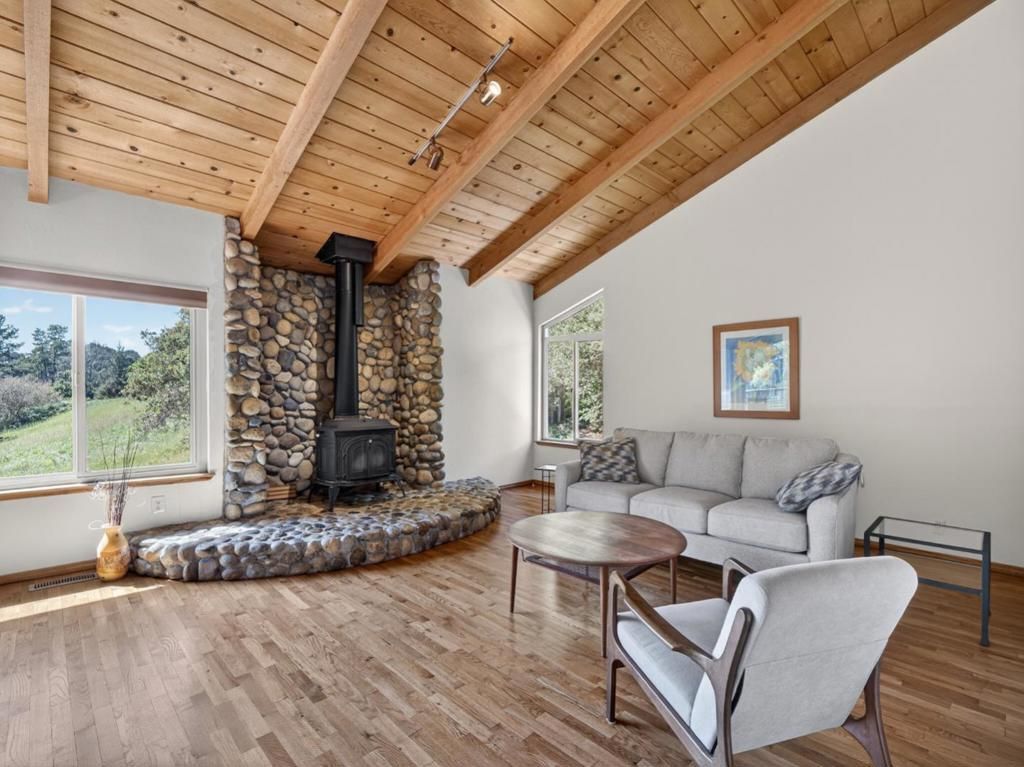 Located in upper La Selva, this 1,989 sq. ft. home offers four bedrooms and three full bathrooms bordering the Santa Cruz Land Trust. The kitchen is equipped with granite countertops, an electric cooktop, dishwasher, microwave, hood over range, refrigerator, and all to, enhance meal preparation. Flooring throughout includes a mix of carpet, hardwood, and vinyl/linoleum surfaces. The living room features a fireplace, providing a cozy atmosphere. Solar Panels are owned as is the Tesla Power station. Laundry facilities are conveniently located in the utility room and include electricity hookup (220V) for washer and dryer. Additional highlights include vaulted ceilings, a breakfast bar in the kitchen area, propane heating with a floor furnace, and a two-car garage. An expansive deck overlooks the Land Trust property. The property sits on a lot size of approximately 17,500 square feet.
